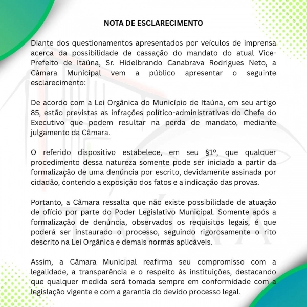 Diante dos questionamentos apresentados por veículos de imprensa acerca da possibilidade de cassação do mandato do atual Vice-Prefeito de Itaúna, Sr. Hidelbrando Canabrava Rodrigues Neto, a Câmara Municipal vem a público apresentar o seguinte esclarecimento: